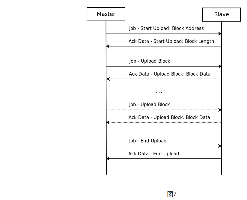 在Ack Data - Start Upload消息中,从设备告知块的长度,然后主设备继续发送Job - Upload Block消息,直到接收到所有字节。最后,它使用Job - End Upload消息关闭上传序列。块的实际数据由从Ack Data - Upload Block消息中发送。