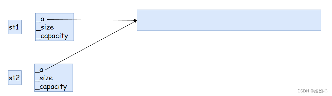 编译器提供的默认拷贝构造对内置类型只会进行值拷贝(浅拷贝),而对自定义类型会调用自定义类型的拷贝构造函数。我们通过画图来看问题出现在哪里!