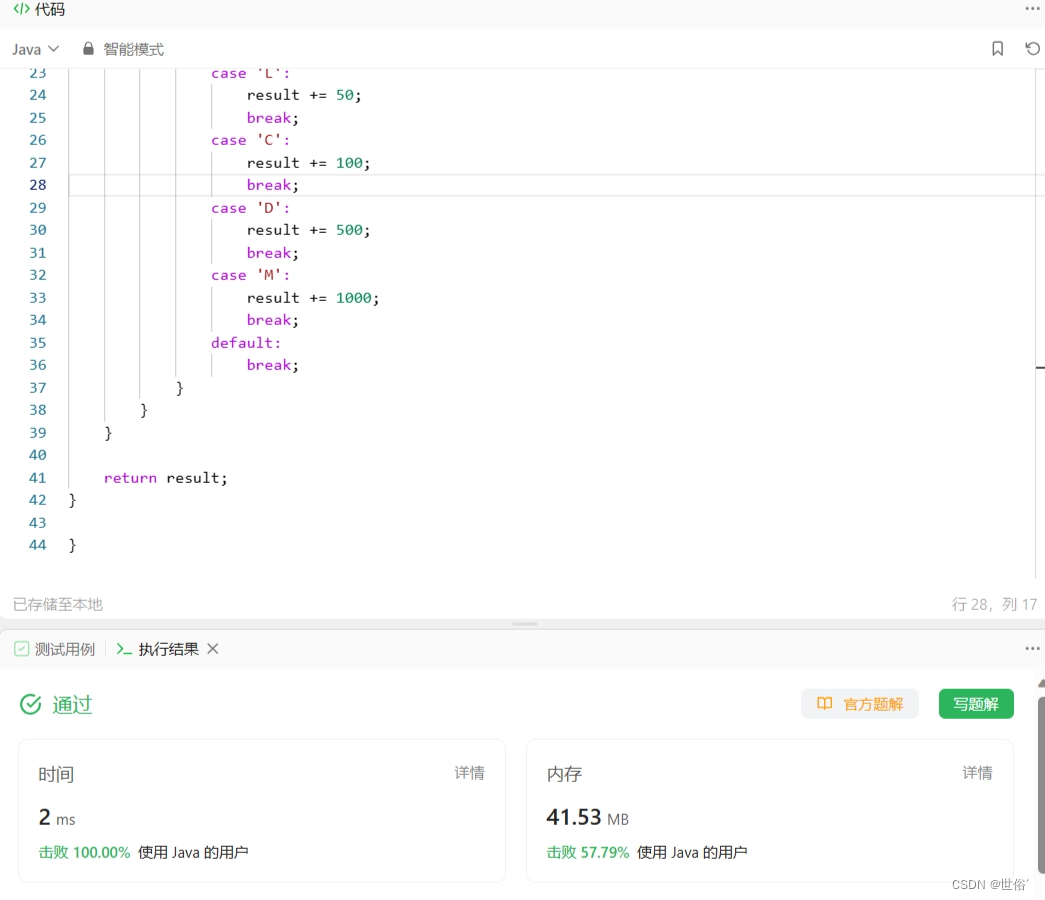 该算法直接根据题目中的规则进行逐个字符判断,并计算最终的整数结果。时间复杂度为O(n),其中n是给定的罗马数字字符串的长度。空间复杂度为O(1)。