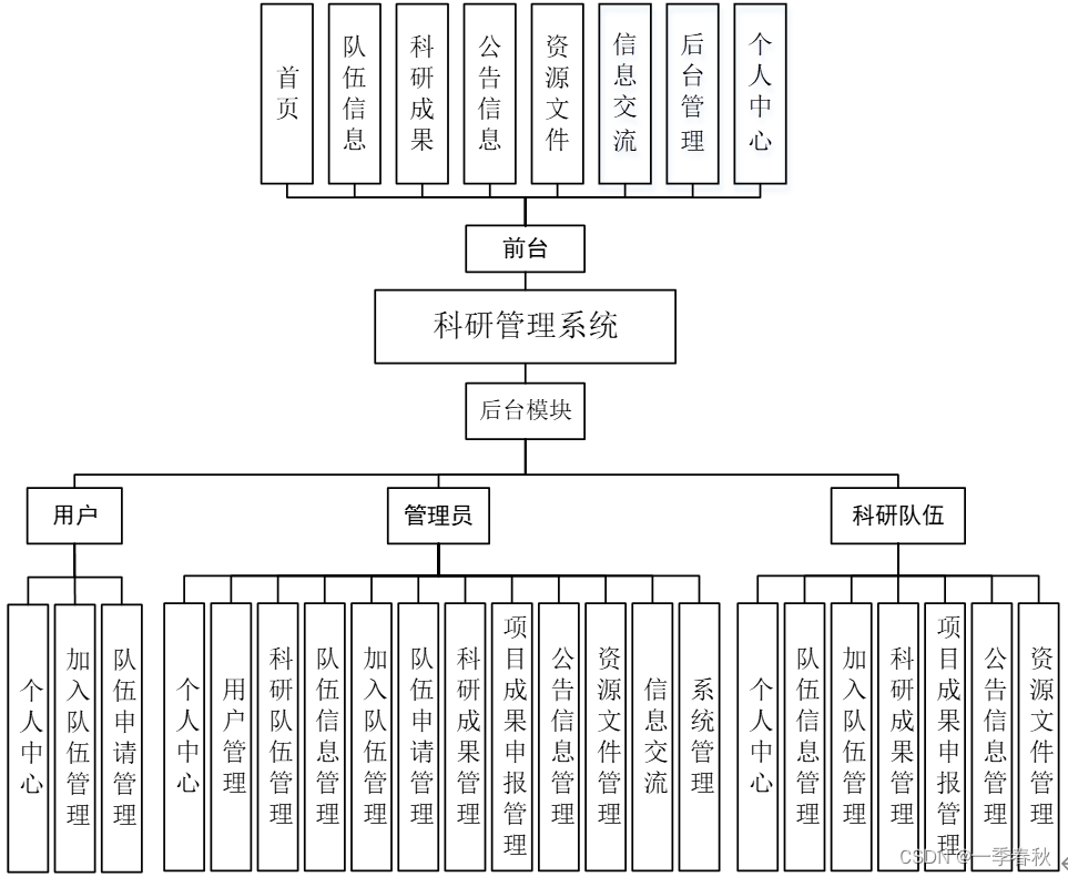 系统整体模块设计:系统分为管理员、科研队伍和用户三大用户角色,系统管理员有最大的权限,整体功能展示如图所示。