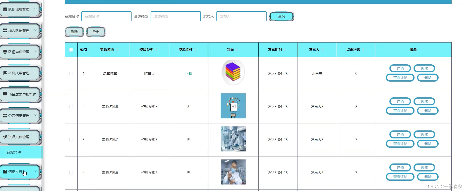 管理员点击资源文件管理。在资源文件页面输入资源名称、资源类型和发布人进行查询、导出或删除资源文件列表,并根据需要对资源文件详情信息进行详情、修改、查看评论或删除操作;如图所示: