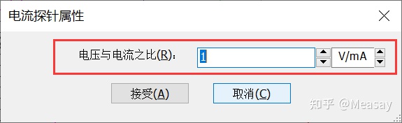下图中设置为1V/mA,也就是说如果回路中流过的电流是1mA,则电流钳输出的电压为1V。该参数可以按需设置。