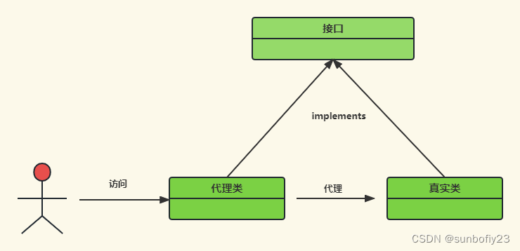 代理模式(Proxy Pattern)是一种结构型设计模式,它的概念很简单,它通过创建一个代理对象来控制对原始对象的访问。代理模式主要涉及两个角色:代理角色和真实角色。代理类负责代理真实类,为真实类提供控制访问的功能,真实类则完成具体的业务逻辑。这样,当我们不方便或者不能直接访问真实对象时,可以通过代理对象来间接访问。是一种AOP编程思想。