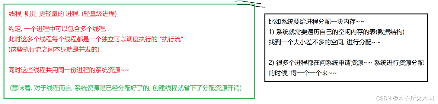 只有在进程启动,创建第一个线程的时候,需要花成败去申请系统资源,一旦进程(第一个线程)创建完毕,此时,后续再创建的线程,就不必再申请资源了,创建/销毁的效率也提高了不少。(线程也被称为“轻量级”的进程)