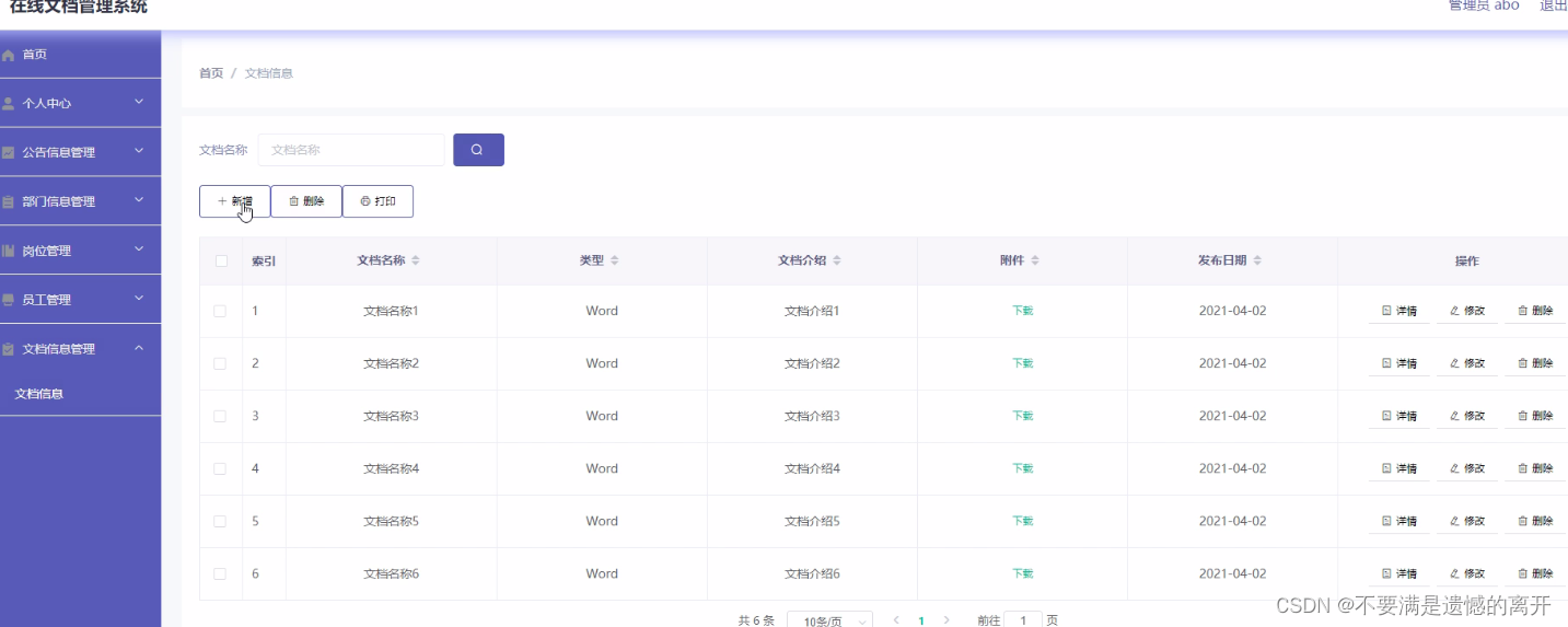 文档信息管理,管理员在文档信息管理页面中可以查看文档名称、类型、文档介绍、附件、发布日期等内容,并且根据需要对文档信息进行详情、修改或删除等详细操作