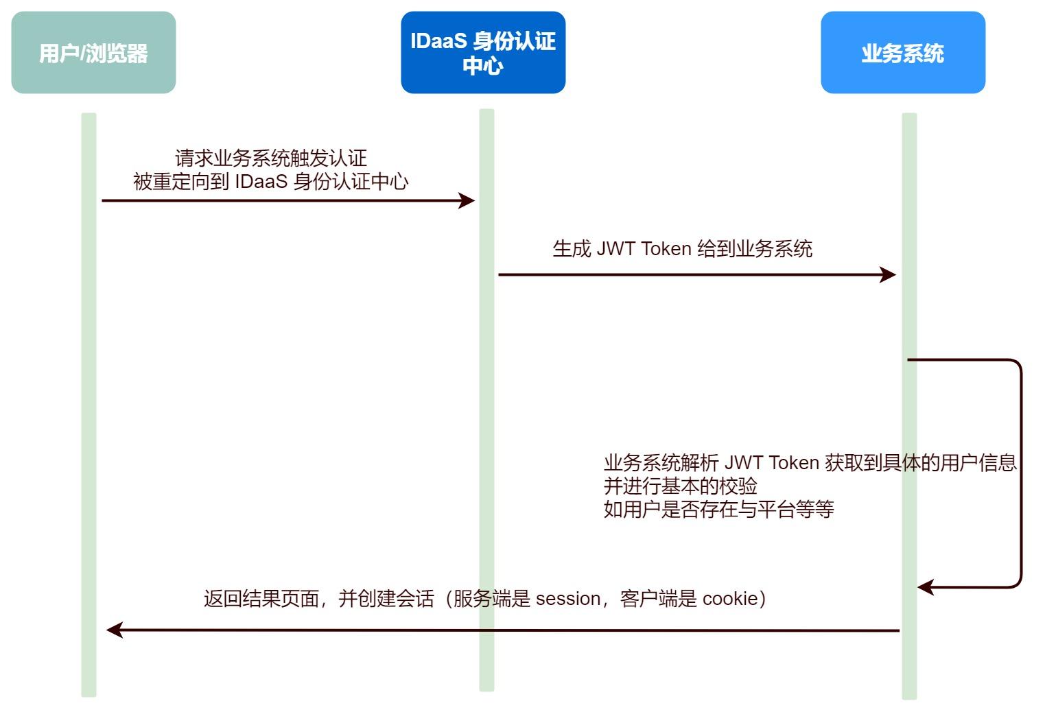 IDaaS 认证完毕后会将用户信息,具体的签名算法,生成一个 JWT ,给到具体的应用(关联系统) ,关联系统用秘钥解析 JWT 并拿到具体的用户信息之后,再去完成自己平台内部的各种校验,进而让该用户完成认证和授权