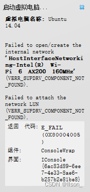 Failed to open/create the internal network 'HostInterfaceNetworking-Intel(R) Wi-Fi 6 AX200 160MHz' (VERR_SUPDRV_COMPONENT_NOT_FOUND).