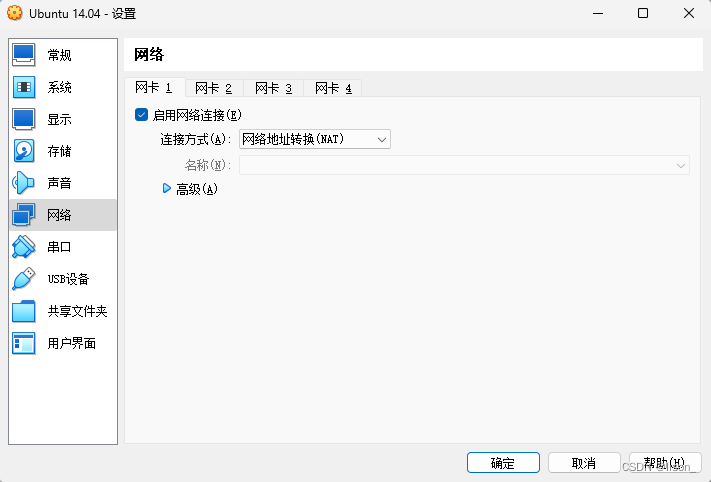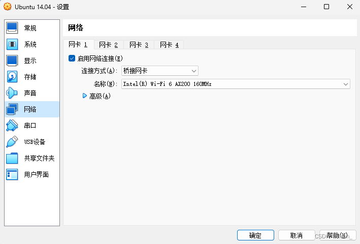 起初我是使用的桥接方式,因为桥接可以有自己的ip,但是现在出了这个问题后就想换个连接方式试试,也是由于看到错误提示了'Intel(R) Wi-Fi 6 AX200 160MHz'字样,没想到更换为网络地址转换(NAT)后竟然神奇的启动了。