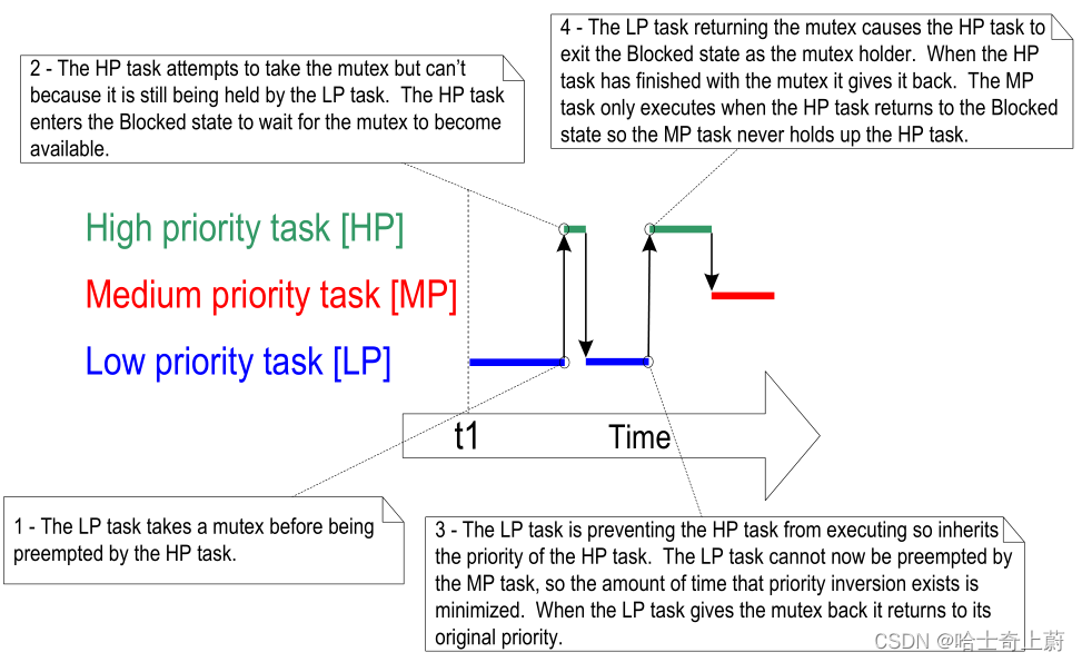 3:LP任务继承了HP任务的优先级,因此LP任务无法被HP任务抢占,它可以继续运行,等到它释放互斥锁后,LP任务的优先级恢复到之前的优先级