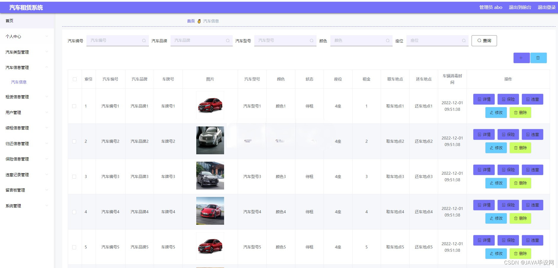 3、功能的完善性:可以管理管理员;首页、个人中心、汽车类型管理,汽车信息管理,租赁信息管理,用户管理、续租信息管理、归还信息管理、保险信息管理、违章记录管理、留言板管理、系统管理,