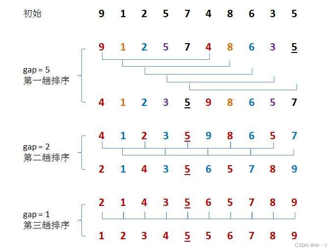 使用两次for循环控制,第一个for循环控制进入组的前后顺序,第二个循环是控制每个组进行的间距以及几个组的结束。然后里面嵌套的内容与直接插入排序相似,只是将1换成gap。这种写法是一组排完,再排另外一组。