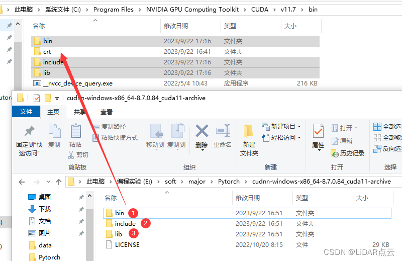 此时,将bin、include、lib文件复制粘贴到cuda安装目录下,里下图: