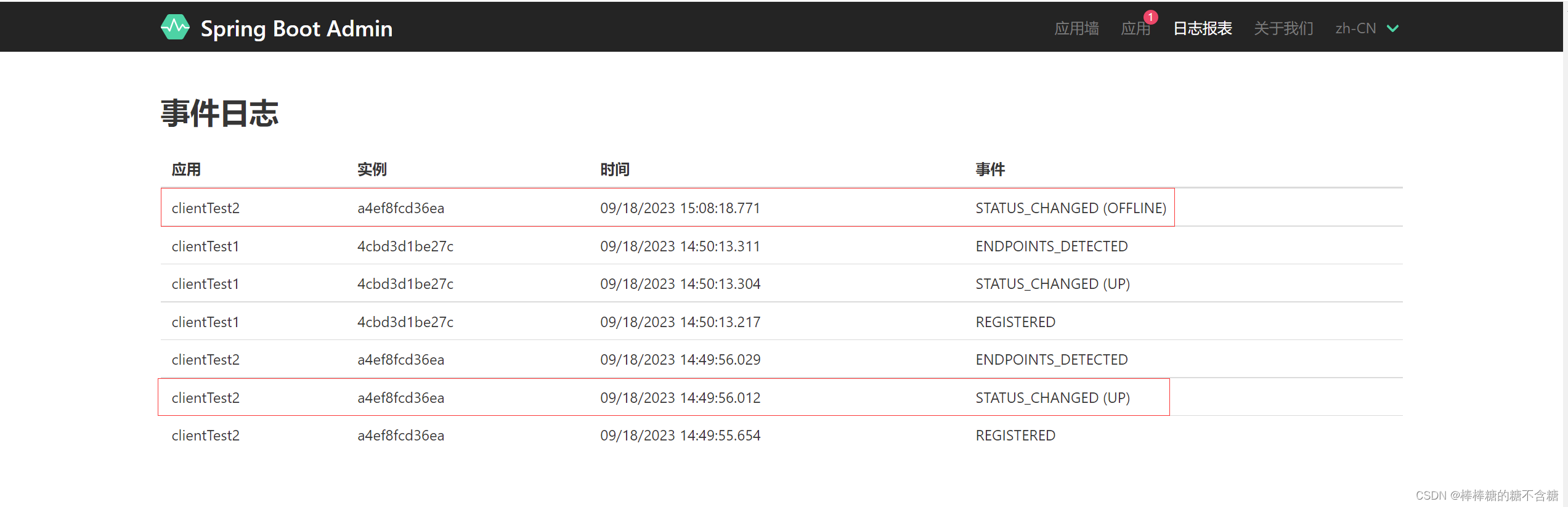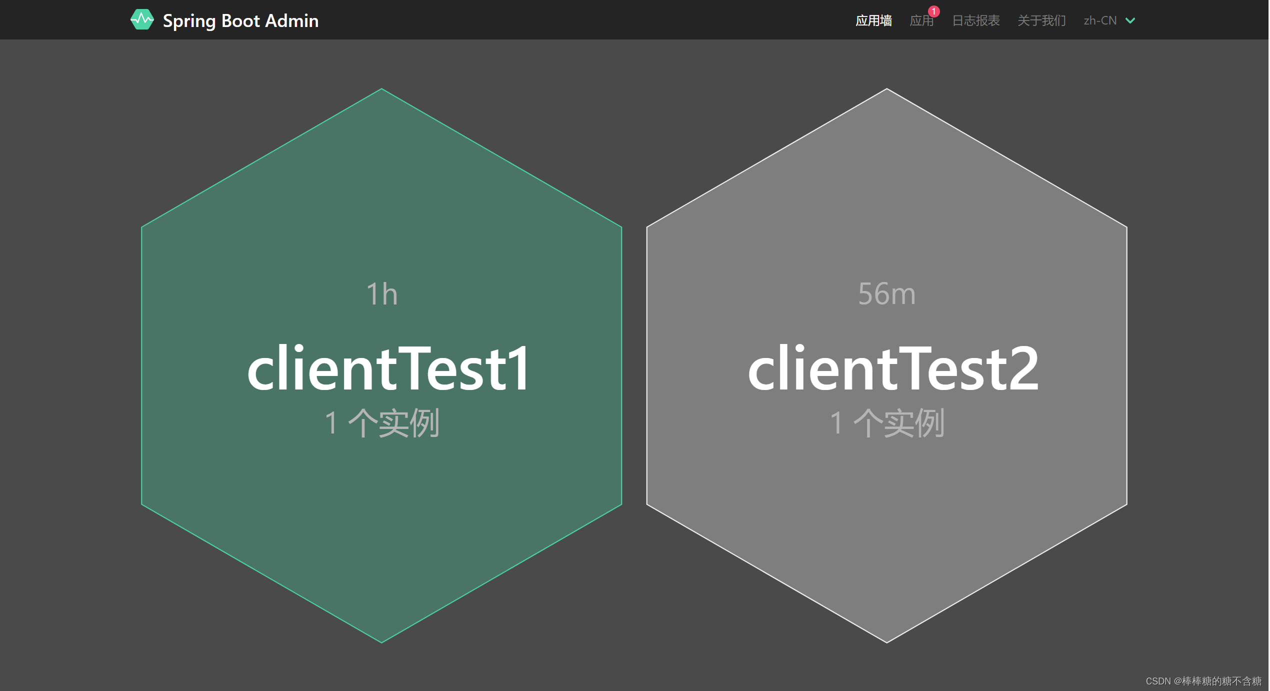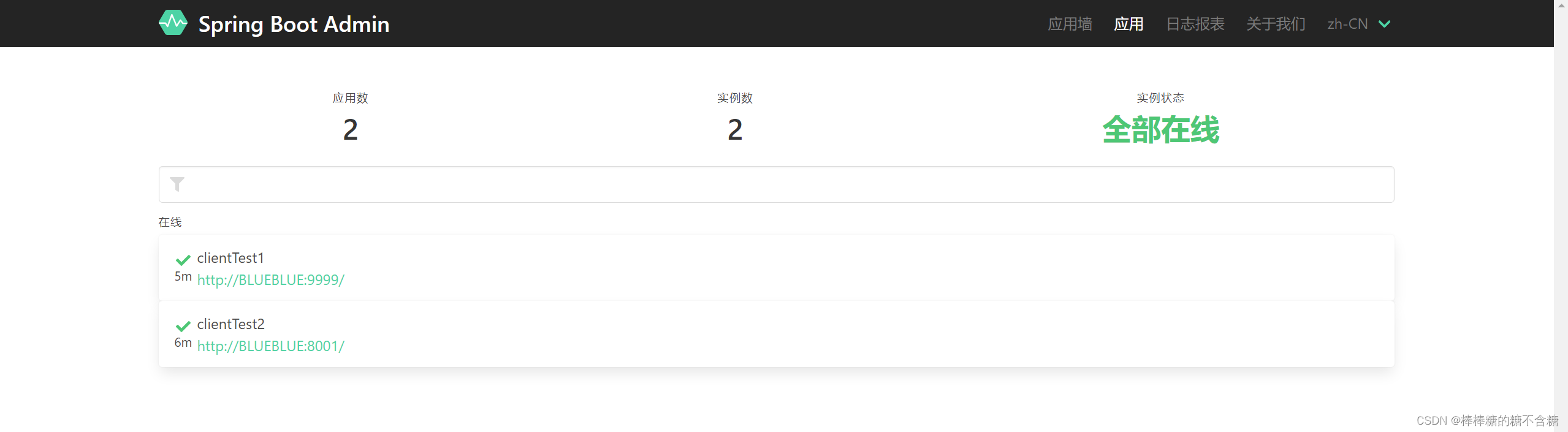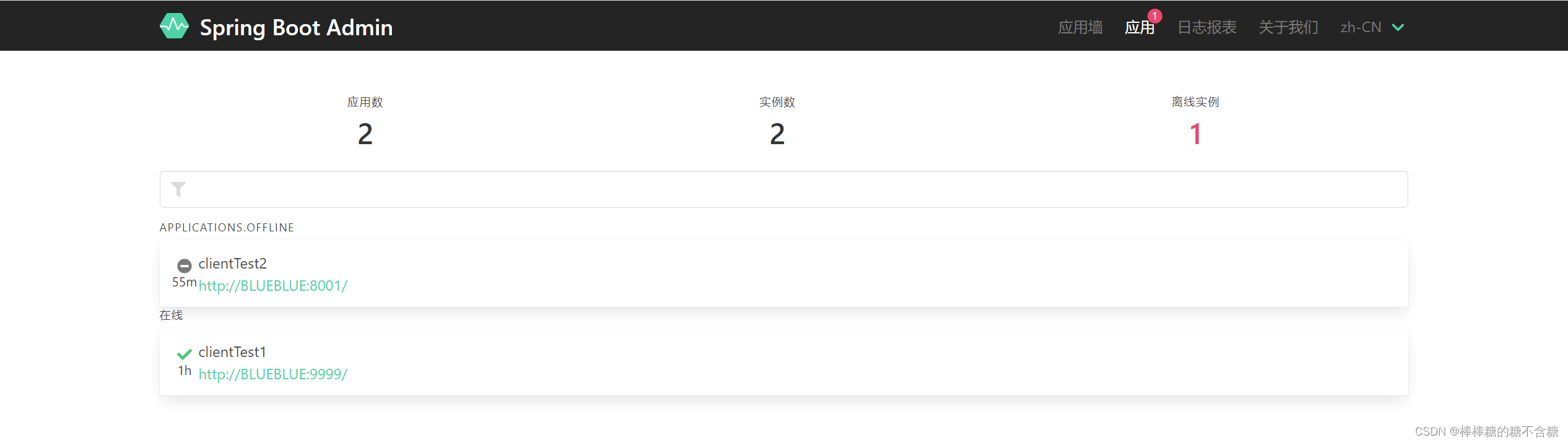 首先搭建监控一个平台和连个客户端,搭建流程见SpringBoot Admin监控平台《一》平台搭建及基础介绍 ,搭建完毕之后,启动各个项目,监控平台的界面如下所示:
