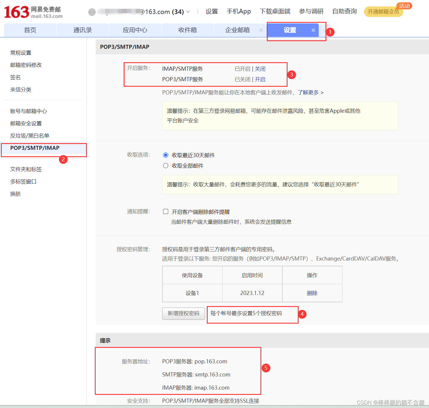 开通后,可以最多生成5个授权码,见④;⑤的地址用于邮件发送时需填写的服务器地址,本博客用不到,所以不做区别介绍。
