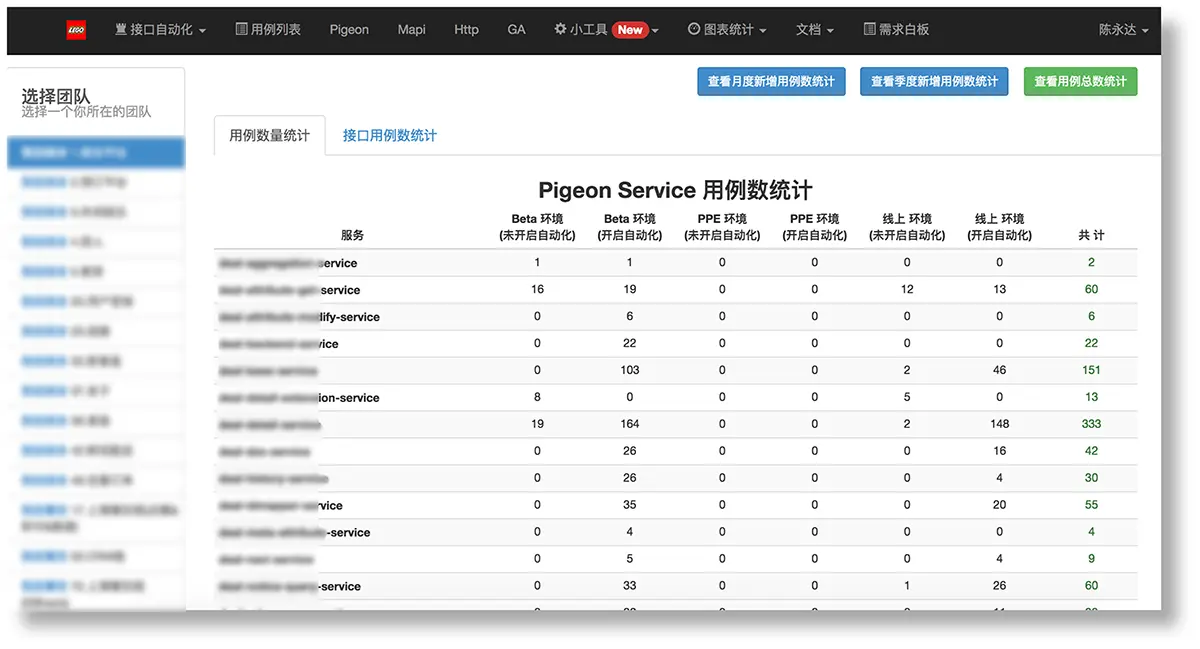 通过线上接口调用量排序的图表。我们可以有效的知道优先维护哪些服务的测试用例,通过表格中,我们可以看到,哪些服务已经覆盖了测试用例,哪些没有被覆盖, 给各组的QA制定用例开发计划,提供参考。