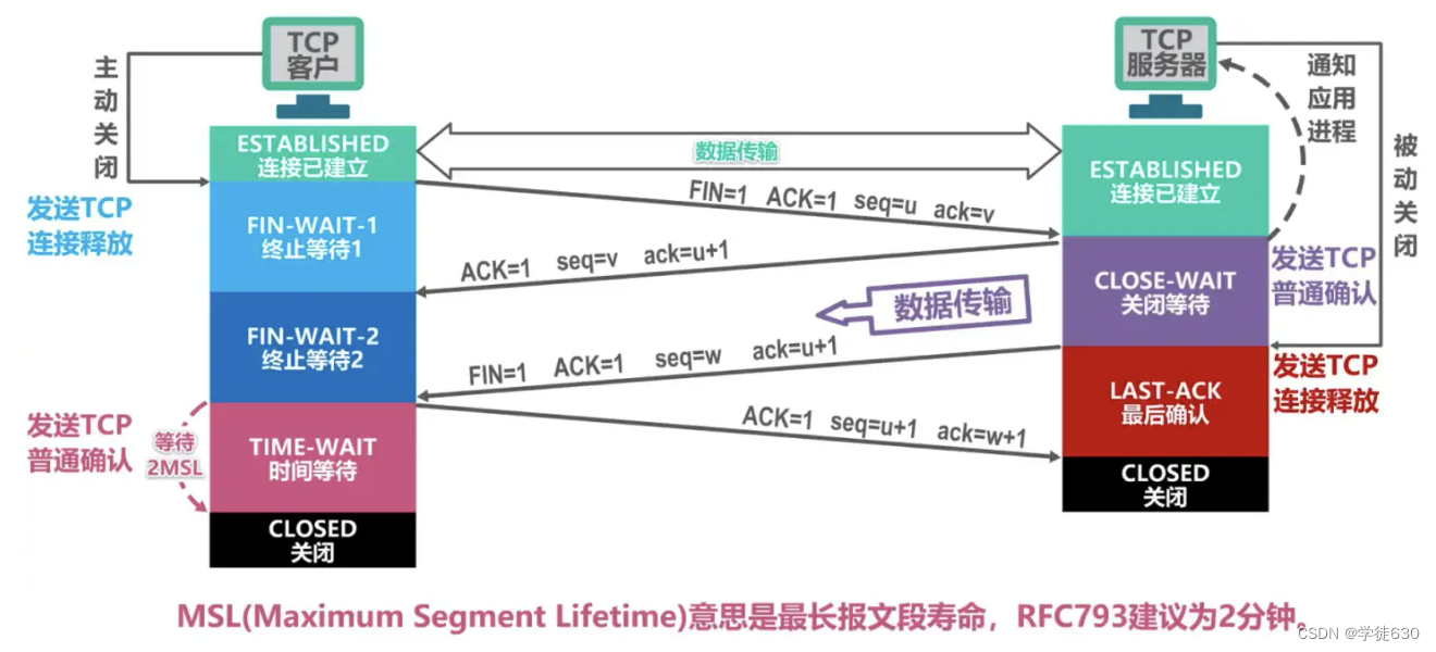 TCP服务器进程收到该报文段后就进入关闭状态,而TCP客户进程还要进过2MSL后才能进入关闭状态