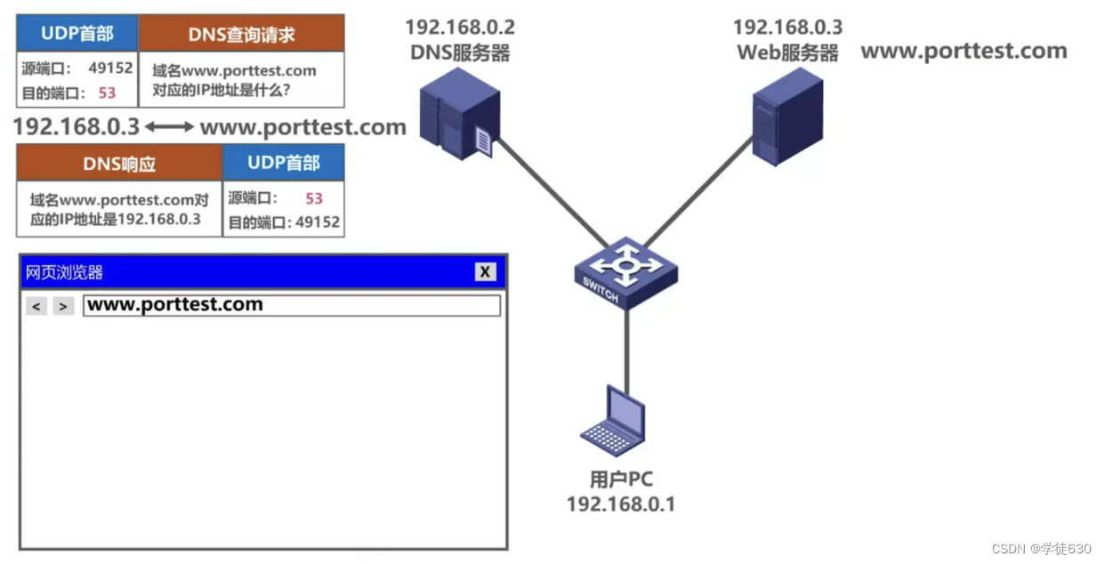 之后,会给用户PC发送DNS响应报文,DNS响应报文需要使用运输层的UDP协议封装成UDP用户数据报