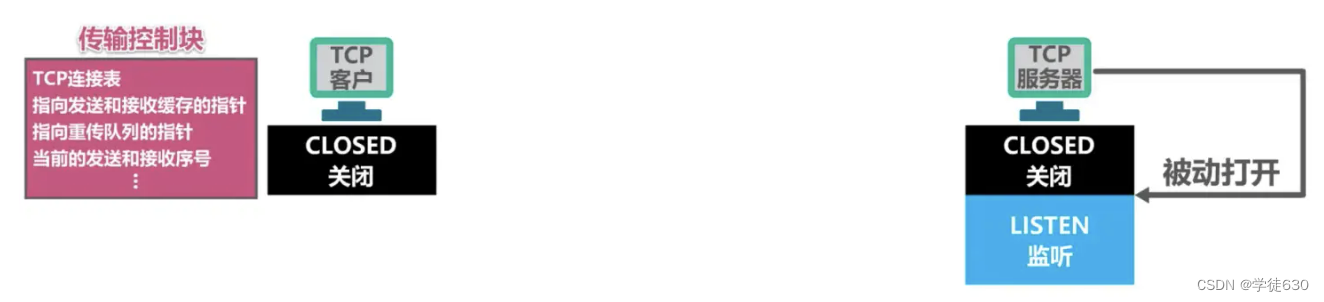 一开始,TCP服务器进程首先创建传输控制块,用来存储TCP连接中的一些重要信息。例如TCP连接表、指向发送和接收缓存的指针、指向重传队列的指针,当前的发送和接收序号等