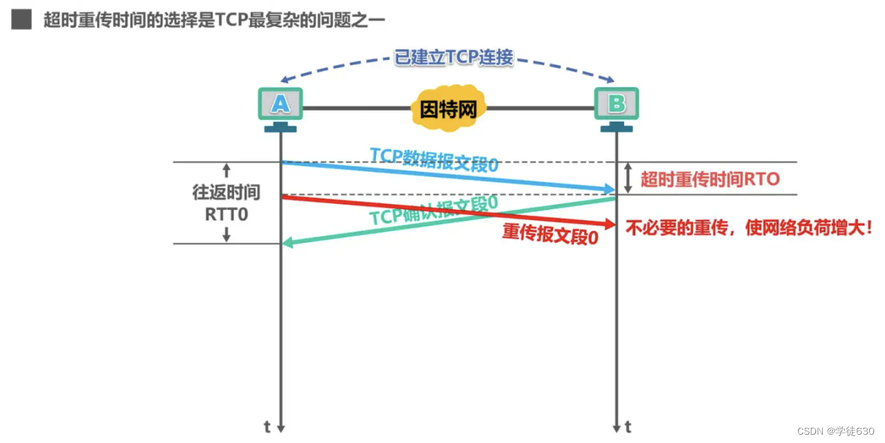 如果超时重传时间RTO的值设置得远大于RTT0的值,这会使重传时间推迟的太长,使网络的空闲时间增大,降低传输效率