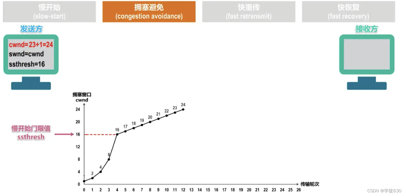 在拥塞避免阶段,具有 “加法增大” (Additive Increase) 的特点。