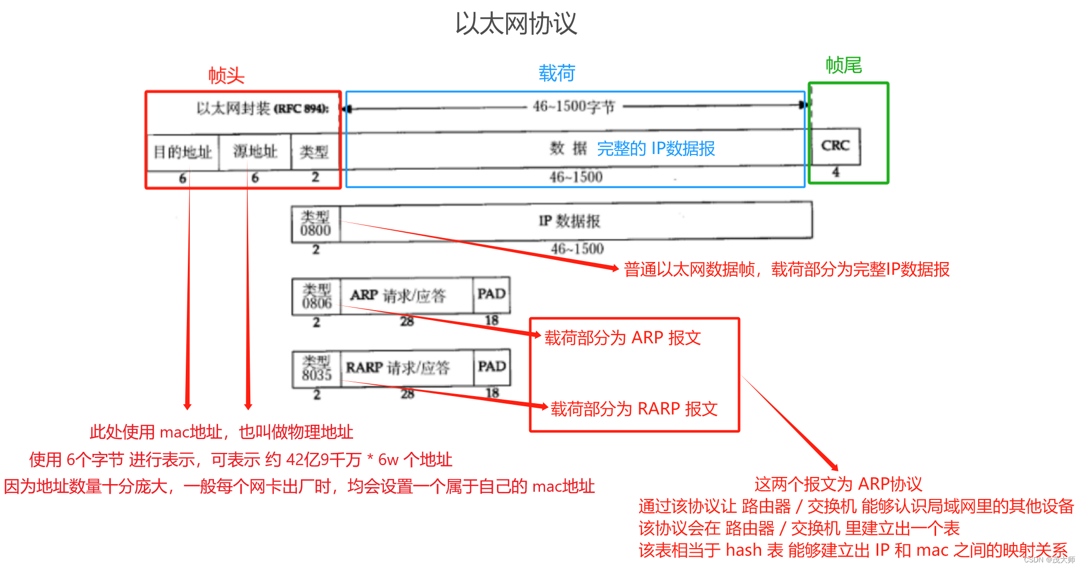 - 以太网协议 规定了 数据链路层 和 物理层 的内容