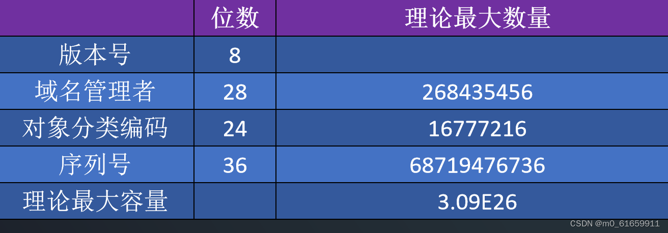 有64位、96位、256位编码结构,目前使用的是96位,二进制编码