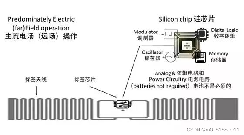 RFID标签:一般由芯片和天线组成,每个RFID标签一般都具有唯一的电子编码,电子标签中存储着物体的相关信息