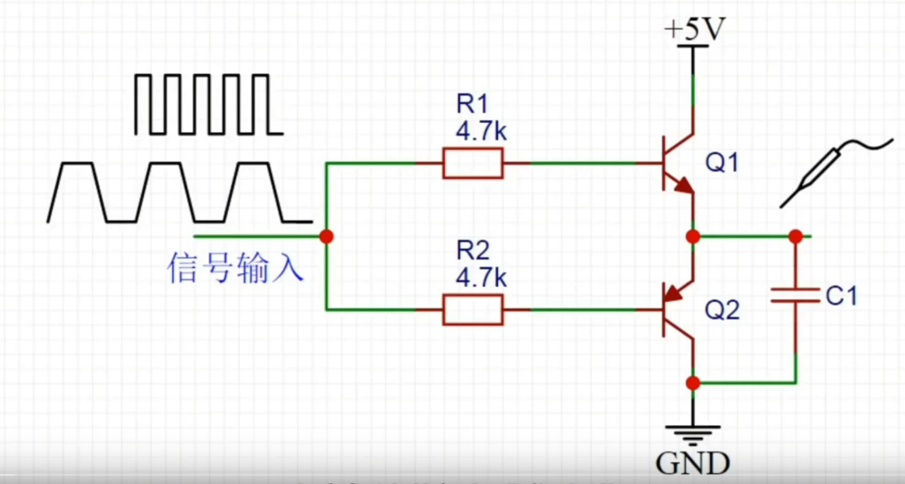 如上所介绍,当输入信号是方波时,输入是5v上方导通,下方不通,充电,输出高电平;