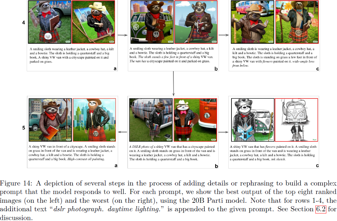 与最近关于文本到图像生成的其他工作一样,本文包括新颖的图像以及为模型生成图像提供的复杂提示,如上一小节所述。 当然,如标题中所述的最具挑战性和最令人印象深刻的例子会被选择(即精心挑选(cherry picked))。 因此,它们通常不代表,例如,单次交互,其中模型直接生成这样的图像作为其排名最高的输出。 正如第 8 节所述,我们无法直接向公众发布我们的模型,因此在本节中,我们希望提供一个简短的窗口,了解 Parti 增加描述性和视觉复杂性的过程,包括事情如何沿着进展顺利进行,或者不能立即发挥作用。