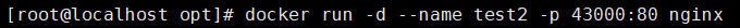 docker run -d --name test2 -p 43000:80 nginx #指定映射端口(小写的p)
