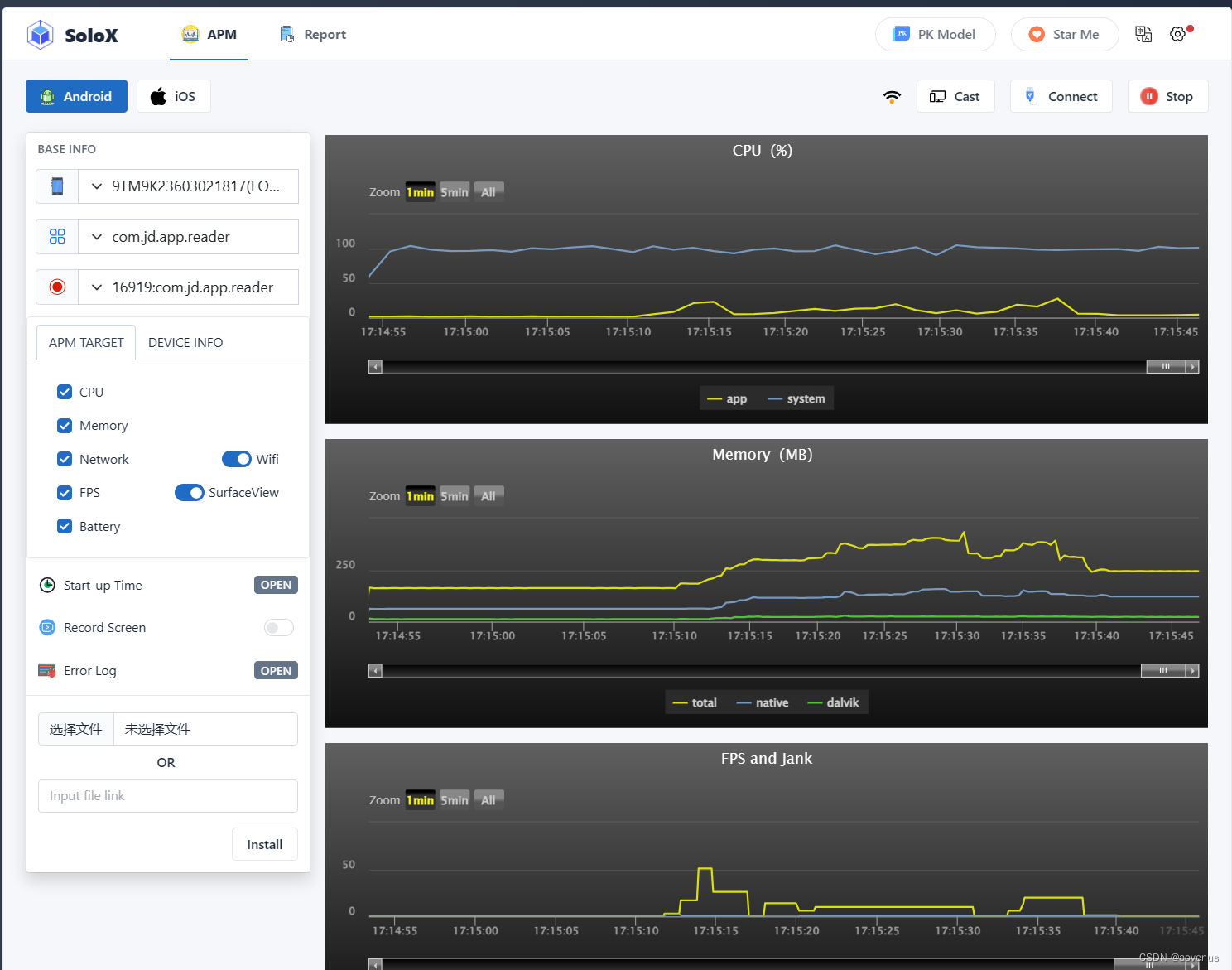 SoloX是开源的Android/iOS性能数据的实时采集工具,目前主要功能特点: