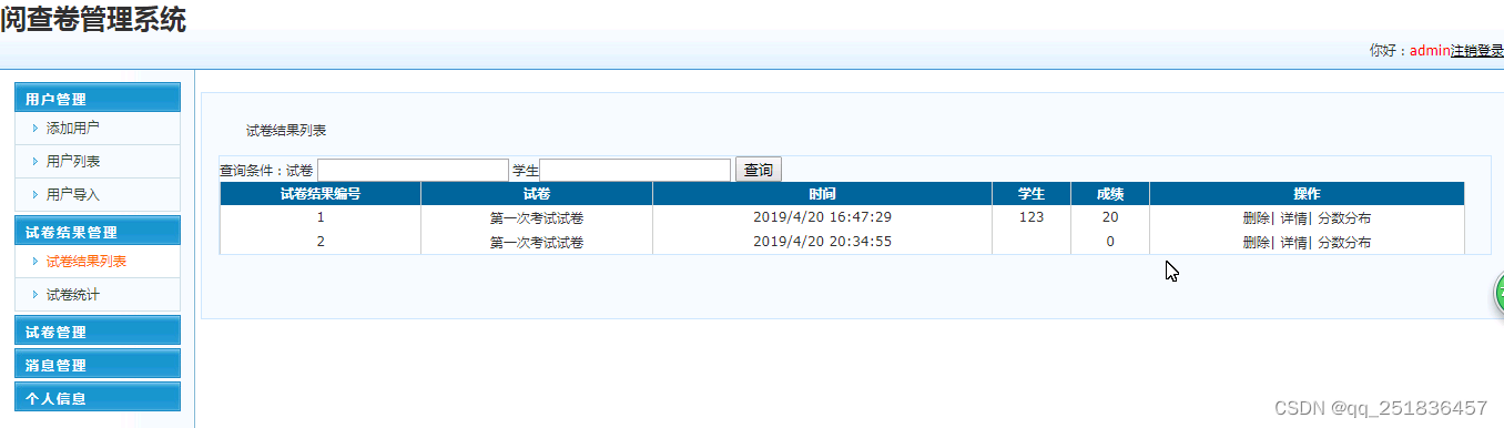 ·删除试卷:需要删除某套试卷时,通过查询可以找到目的试卷,点击删除即可。