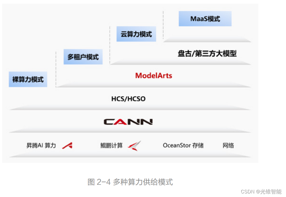 华为从最底层打造了一个最全的生产工厂,也提供了各类服务。如在异构计算架构层不仅支持不同类型的处理器,还提供了四种算力供给模式, 一种是直接卖服务器的裸算力模式;第二种是租服务器的租算力模式;第三种是通过服务器打造一个云服务空间,提供算力支持;最后一种是以MaaS服务的方式提供算力。