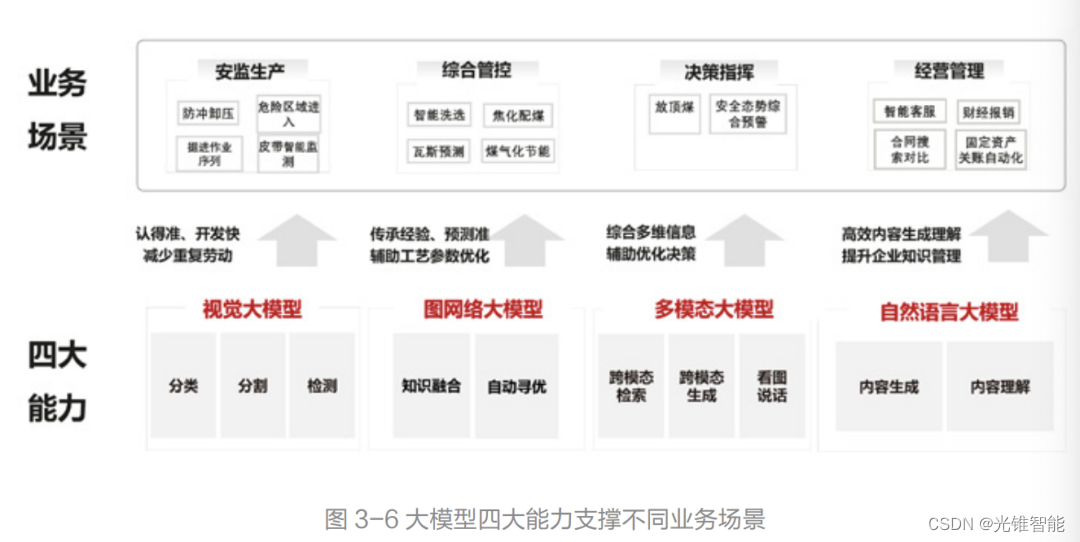 同样,煤炭行业面临着开采地质条件复杂、灾害多发(如煤尘、水、火、瓦斯和顶板等自然灾害)、生产效率较低、作业环境恶劣、人员短缺等挑战,为应对这些挑战,大模型在尽量增安、少人。仅以瓦斯隐患预测一个场景举例,借助大模型对井下采煤、设备、矿压、通风、安全监测、地质、瓦斯抽取等系统数据进行智能融合分析,对井下关键位置瓦斯浓度进行预测,实现瓦斯隐患的超前预警。
