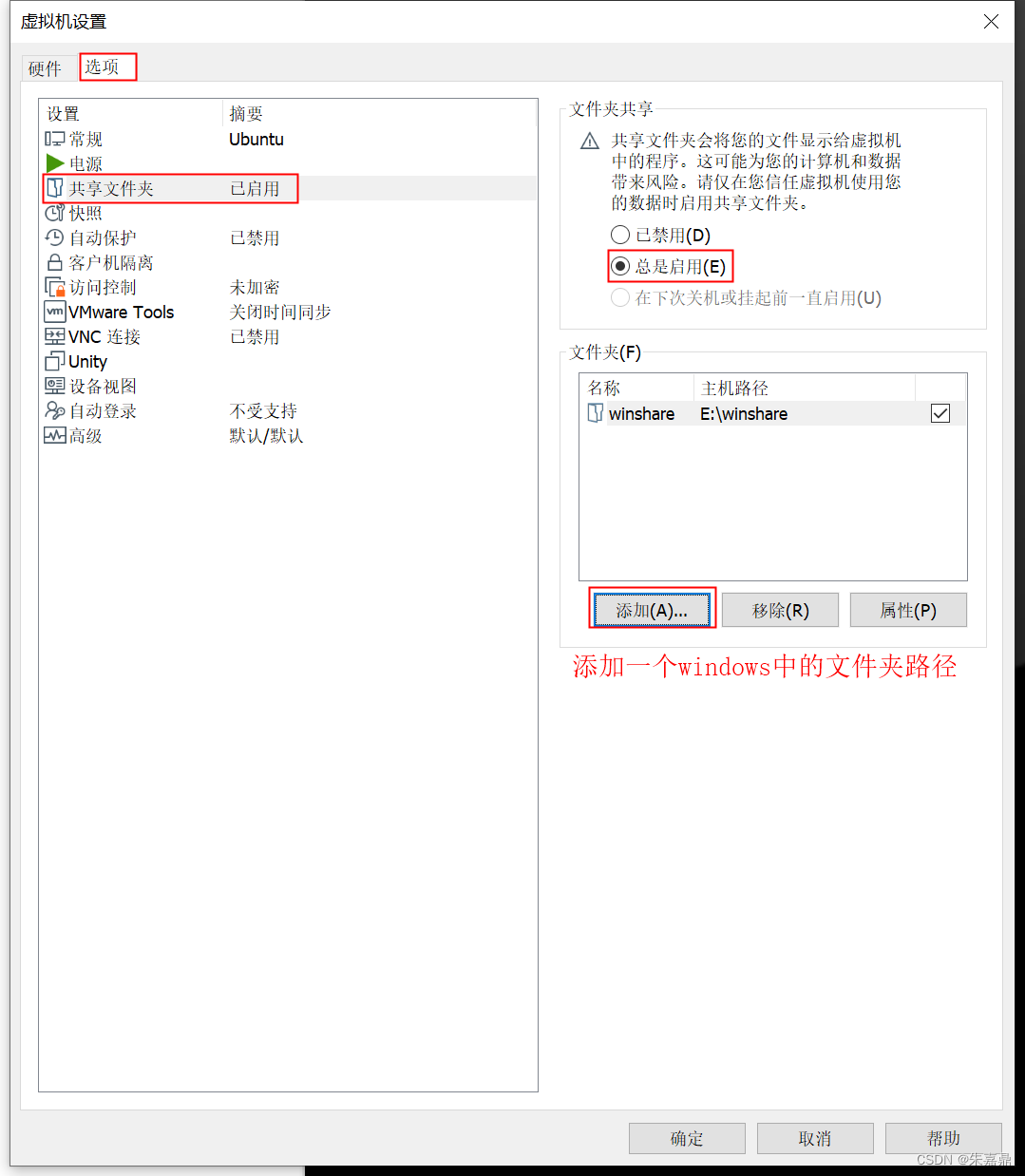 (2)依次点击“选项”→“共享文件夹”,配置如下,点击确定。