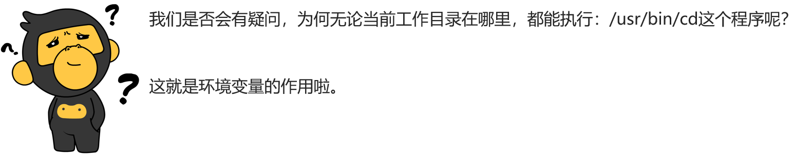 在前面提出的问题中,我们说无论当前工作目录是什么,都能执行/usr/bin/cd这个程序,这个就是借助环境变量中:PATH这个项目的值来做到的。