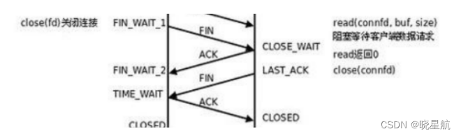 - [CLOSE_WAIT -> LAST_ACK] 进入CLOSE_WAIT后说明服务器准备关闭连接(需要处理完之前 的数据);当服务器真正调用close关闭连接时,会向客户端发送 FIN,此时服务器进入 LAST_ACK状态,等待最后一个ACK到来(这个ACK是客户端确认收到了 FIN)
