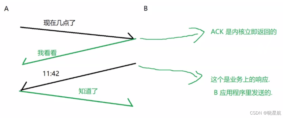 A 给 B 发了个信息,B 收到之后就会返回一个 应答报文(ACK) — answer,此时 A 收到应答之后,就知道了刚才发的数据已经顺利到达 B 了。