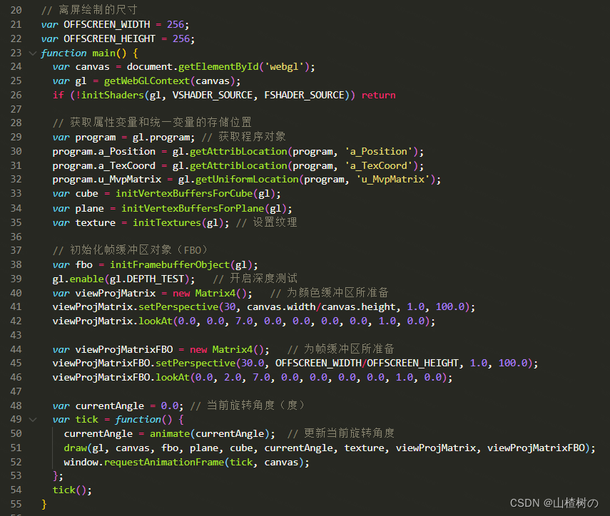 如下显示了draw()函数的代码。该函数首先把绘制目标切换为帧缓冲区对象fbo,并在其颜色关联对象,即在纹理对象中绘制了立方体。然后,我们把绘制目标切换回<canvas>,调用drawTextureddPlane()函数在颜色缓冲区中绘制矩形,同时把上一步在纹理对象中绘制的图像贴到矩形表面上。