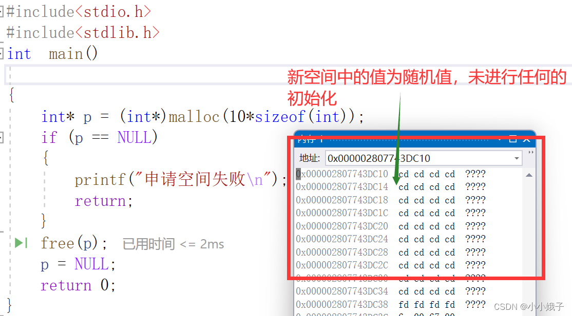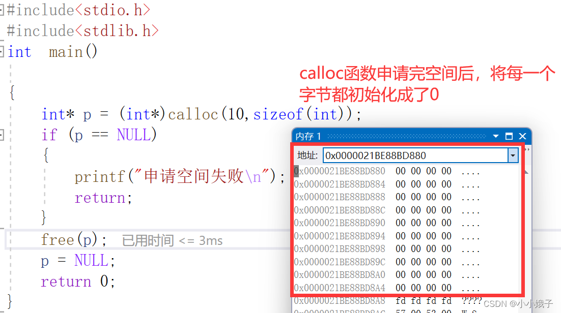 前面malloc函数开辟的内存还没释放,接下来它们配合使用。