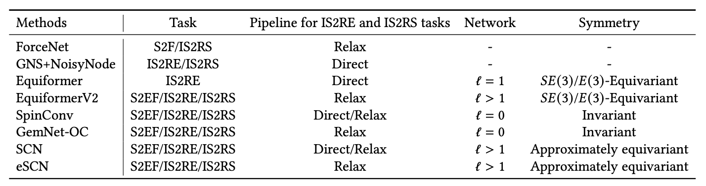 对于上述不同的问题,存在不同的挑战。首先,对于能量预测问题(S2E),模型预测必须具有旋转不变性,因为能量是一个结构级的属性,对于分子-材料对结构的旋转是不变的。与能量不同,力预测问题(S2F)旨在预测每个原子的力矢量。因此,力的预测必须对结构的旋转具有等变性。类似地,弛豫能量预测问题(IS2RE)和弛豫结构预测问题(IS2RS)具有保持不变性和等变性的相同挑战。除了对称性,IS2RE和IS2RS问题还面临另一个挑战,即初始结构只提供了关于弛豫结构的粗略提示。因此,模型必须考虑结构弛豫,包括分子和材料原子,以获得准确的预测。
