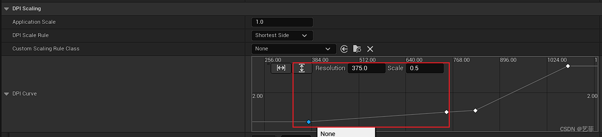 因为我们这个程序是手机竖屏使用的,所以DPI Scale Rule选择Shortest Side,然后在下图中折线上点击鼠标选择Add key ,添加一个分辨率对应的DPI比例关系