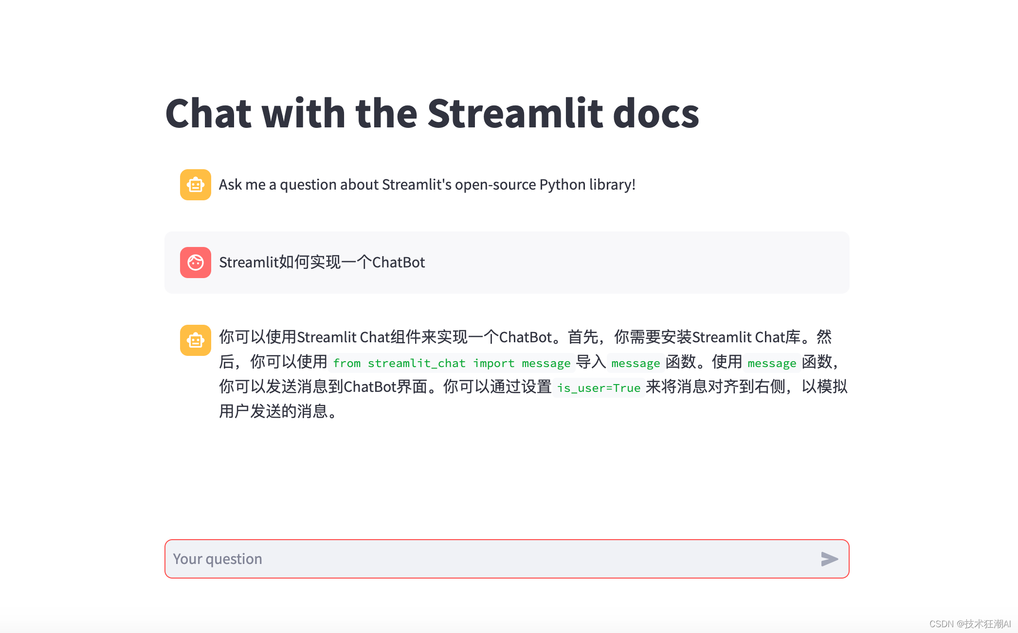 以上是一个用 Streamlit 构建的 Streamlit docs 文档聊天机器人。