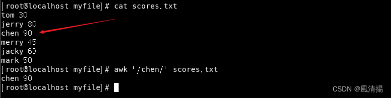 awk '/chen/' scores.txt