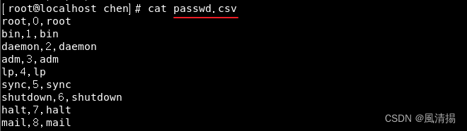 - 在这个示例中,-F, 指定逗号 , 作为字段分隔符,然后打印每行的第一个字段。