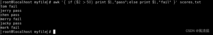 - 在这个示例中,-f 选项指定了一个名为 myscript.awk 的脚本文件,awk 将执行其中的命令。