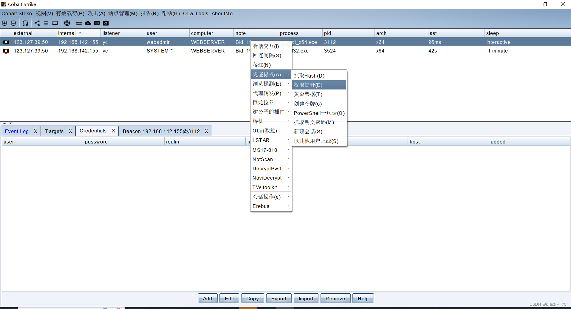 右键选择凭证提权,权限提升进行提权,这里我选择的是ms14-058