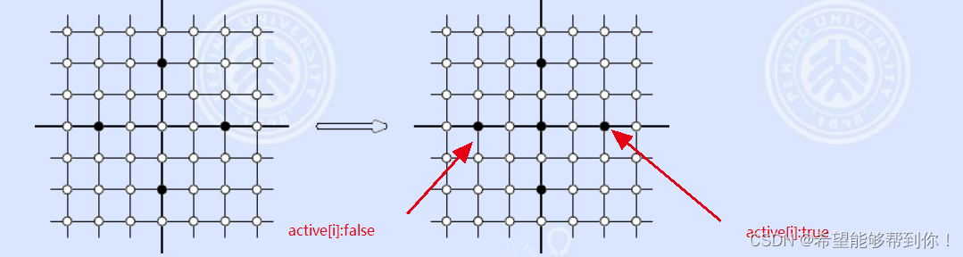 同时遇到每一行第一个棋子时,要把这一行标记上,然后这一行的位置更新到0(更新到0是因为这一行之前左边没有棋子,如果左边没有棋子,那么这些+1的情况,即便上下有子也不应该记录到答案里,为的就是防止下图中红色箭头的位置被错误记录了),这样下次再碰到这一行的棋子,就可以代表两者之间的部分位置可以加到答案里。