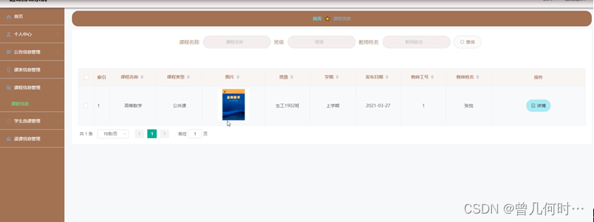 课程信息管理:通过列表可以查看课程名称、课程类型、图片、班级、学期、发布日期、教师工号、教师姓名等信息,管理员可以进行查看详情、新增、修改或删除操作